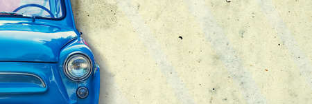 The headlight of the old beautiful car on the background of a concrete wall. Copy space. Concept banners repair, sale of cars. Close-up.