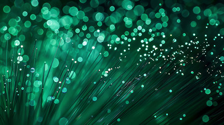 Captivating close-up of green fiber optic strands creating a mesmerizing bokeh effect. Blurred lights and intricate details intertwine for a visually stunning effect.