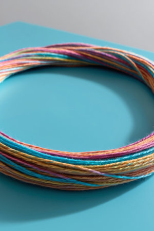 AI Generated. Multicolored Yarn Strands Forming a Circle on a Blue Surface