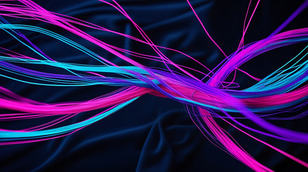 A collection of colorful threads are featured against a dark background. The strands are arranged in a flowing, wave-like pattern, showcasing a spectrum of colors from red and orange to green and blue. This artistic composition offers versatility for commercial design and advertising applications.