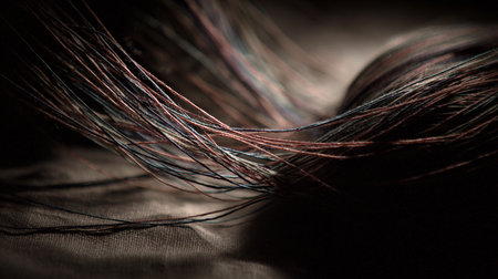 Panoramic full-frame shot of black hair interspersed with tiny reflective particles resembling stars or galaxies, surreal macro texture