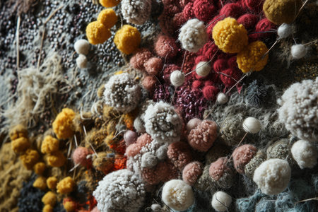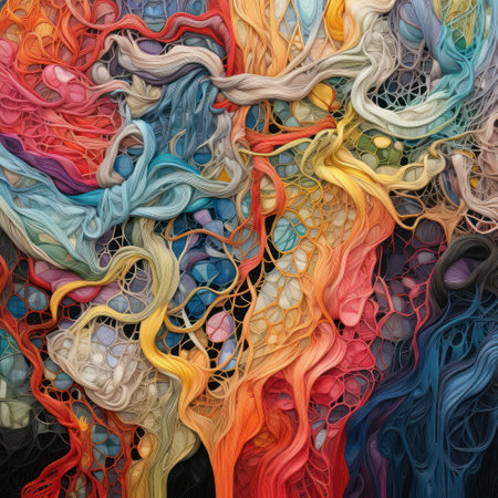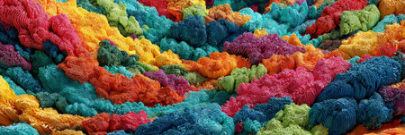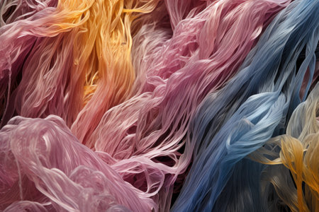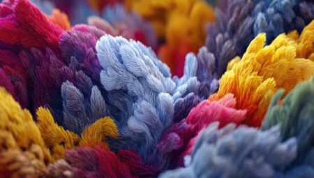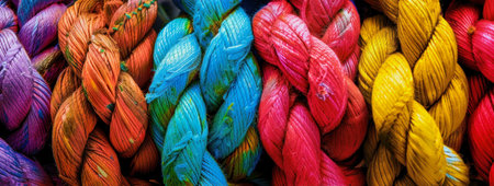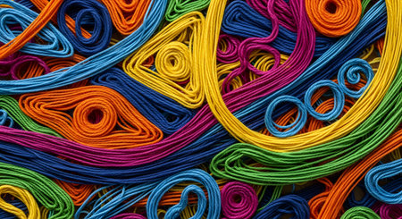 A vibrant and colorful arrangement of various textile fibers and threads showcasing intricate textures and patterns ideal for textile and craft projects.