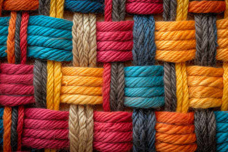 Close-up of colorful textile weave with intricate twisted yarn patterns. That the image is generated using AI.