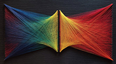 Vibrant string art piece displays colorful threads arranged in a gradient pattern, emphasizing creativity and artistic craftsmanship against a dark backdrop, AI generated