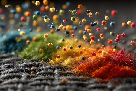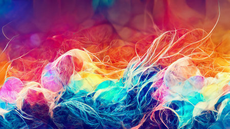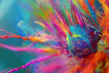 A dynamic display of colorful wool fibers exploding in mid-air, captured in stunning macro detail. the vibrant colors create a striking contrast against the textured, dark background, the intricate beauty of the fibers. Generative AI