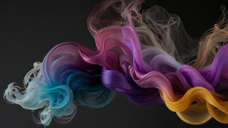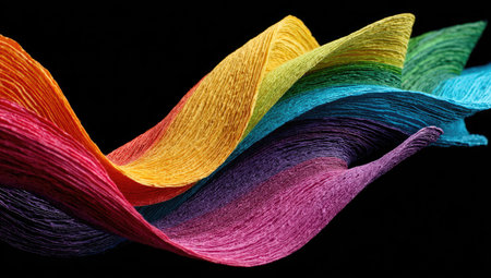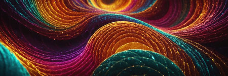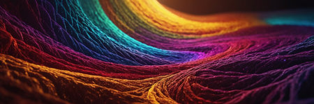Vivid, multi-colored strands of fiber flow against a black backdrop, creating a dynamic wave