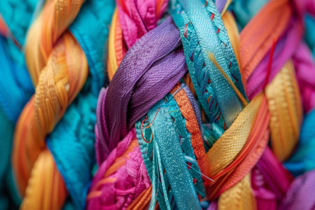 Detailed view of intricately braided rope with vibrant colorful ribbons intertwined, A close-up of braids woven with colorful ribbons