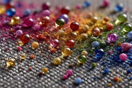 Multicolored beads scattered across a textured fabric create a vivid visual display. the glowing, transparent spheres reflect light, enhancing the vibrant colors and offering an artistic element ideal for creative design or craft projects. Generative AI