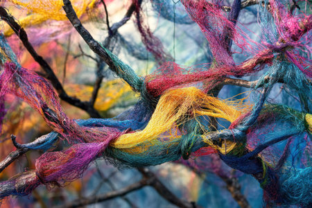 A close-up of intertwined tree branches, each covered in colorful silk threads that intertwine and swirl around them. The background is blurred to emphasize the intricate patterns created by their entanglement. --ar 3:2 --v 6.1 Job ID: e71abd53-41a6-4665-bea6-034d555bb7c6