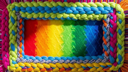 A rectangular frame made of thick, colorful braided yarn surrounds a vibrant rainbow gradient. The frame features multiple layers and textures of braided material in various bright...