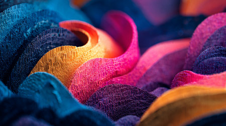 This image presents an abstract composition of colorful textiles, showcasing a variety of hues and textures. The artwork features flowing, rounded forms in shades of blue, orange, yellow, and red. The lighting enhances the tactile qualities, suggesting a soft, woven material, suitable for various design and decorative applications.