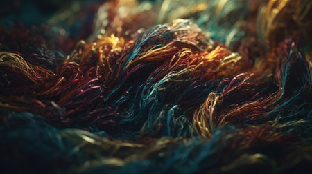 Colorful textile fibers close-up: red, orange, pink, blue, yellow textures. That the image is generated using AI.