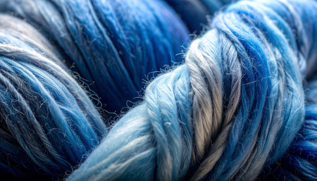 A macro view reveals the intricate twists and soft textures of variegated blue and white yarn.