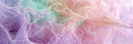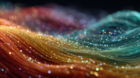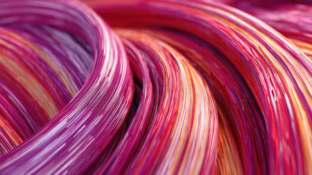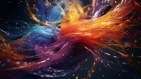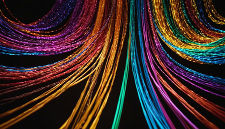 A collection of colorful threads are featured against a dark background. The strands are arranged in a flowing, wave-like pattern, showcasing a spectrum of colors from red and orange to green and blue. This artistic composition offers versatility for commercial design and advertising applications.