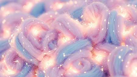 A close-up macro view fluffy pastel pink and blue cotton candy intertwined with glowing warm fairy lights.