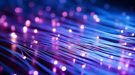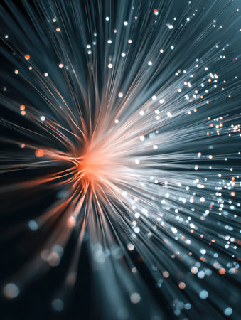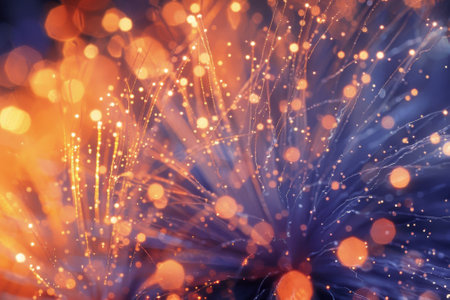 Vibrant fiber optic filaments radiate vivid blue and orange points, creating a lively, intricate web of energy against a shadowy backdrop.