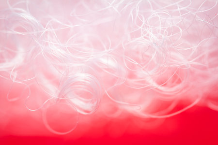 Extreme macro of polyester stable fiber on red background. Selective focus, shallow depth of field. Abstract dreamy background
