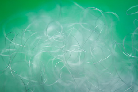 Extreme macro of polyester stable fiber on green background. Selective focus, shallow depth of field. Abstract dreamy background