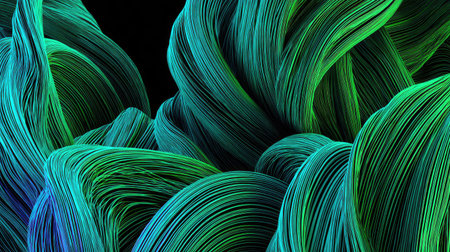 An abstract artwork features flowing lines in shades of teal and green, creating a sense of movement. The composition is set against a black backdrop, with a focus on texture and form. The design could be used in various commercial applications and creative projects.