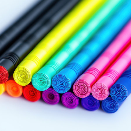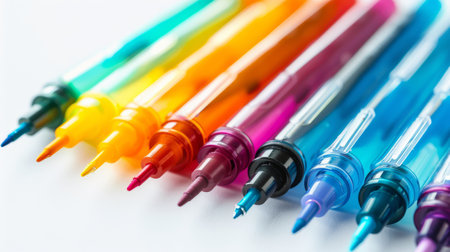 A vibrant collection of colorful writing instruments displayed on a clean surface. Perfect for creative projects, artistic endeavors, and office use.