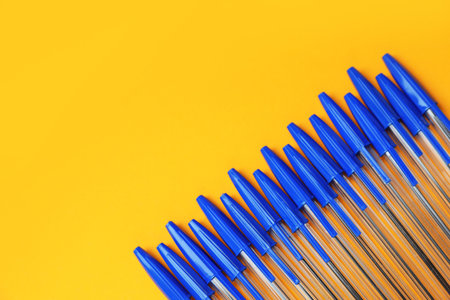 Many ballpoint pens with caps on orange background, flat lay. Space for text
