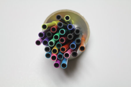 Close-up of colored pens in a glass jar, with their vibrant colors creating a visually appealing pattern