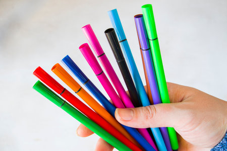 A beautiful shot of a person holding colorful pens a gray background