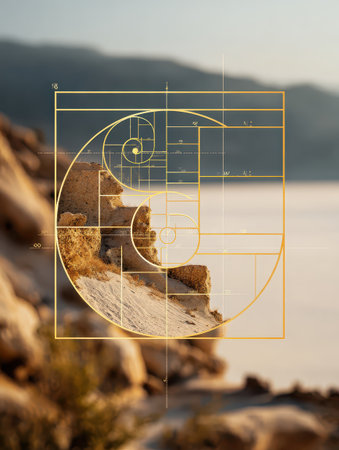 Golden ratio spiral over natural landscape. AI-generated.