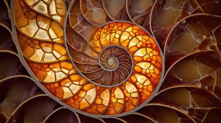 Explore the stunning detail of an intricate nautilus shell featuring Fibonacci spiral patterns. This close-up macro photograph showcases the natural beauty and complexity of marine life.