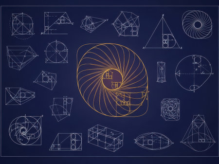 Intricate golden Fibonacci spirals and geometric diagrams are overlaid on a dark blackboard filled with mathematical equations and scientific notations