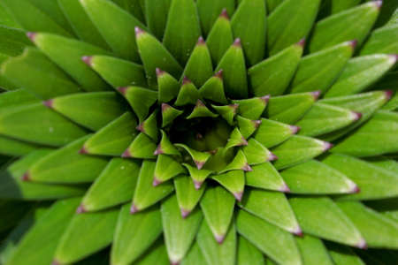 Close-up image of a succulent plant's leaves arranged in a striking spiral pattern. The vibrant green color and intricate geometric design create a visually appealing image. The image focuses on the detailed texture and structure of the leaves.