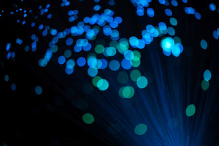 A macro shot shows thin fiber optic cables transmitting data as light pulses against a dark and diffused background The cables are mostly blue and green hues with small dots of light at the ends giving a bokeh effect This abstract image can be used to represent complex networks data transmission internet infrastructure technology advancements scientific research modern communication systems connectivity solutions neural networks or artificial intelligence conceptualizations The photograph has a shallow depth of field focusing on a specific section of the cables giving it a selective focus
