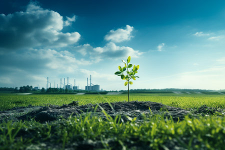 Industrial scene with a mix of machinery and a green plant thriving under a bright blue sky, symbolizing balance.