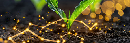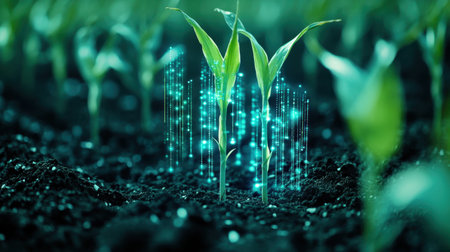 Corn seedlings thrive in rich soil, enhanced by digital data visualizations that symbolize the future of agriculture and sustainable farming practices in a vibrant ecosystem.