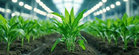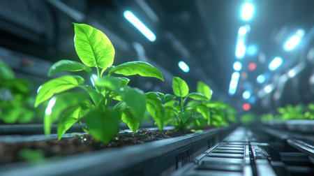 A vibrant green plant stands out in a modern greenhouse, showcasing advanced agricultural practices and sustainable growth techniques.