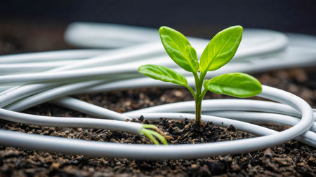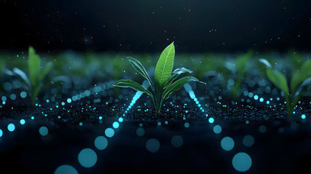 A green plant rises from moist soil against a backdrop of glowing lights, symbolizing the harmony between nature and technology in a futuristic setting.