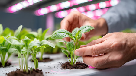 close-up of seedling being taken care of by a specialized team, created with generative ai