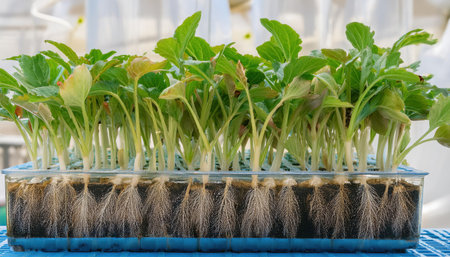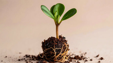A detailed view of young, healthy green plants emerging from dark, fertile soil, showcasing their intricate root systems.
