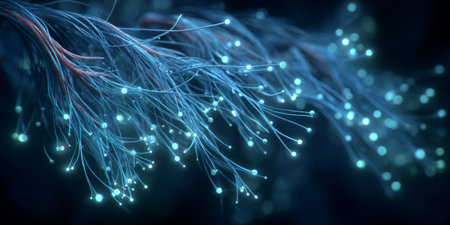 Numerous fiber optic cables create a vibrant blue burst of light against a clean white backdrop, symbolizing the power and speed of modern telecommunications technology