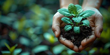 A pair of hands cradles a young plant emerging from rich soil, symbolizing growth and sustainability in nature. Perfect for eco-friendly themes.