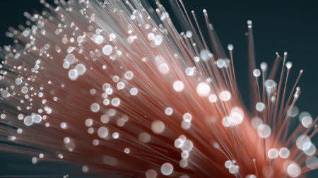 Fiber optic wires with flashing signals. Digital data transmission via fiber optic cable. Bouquet of colored optical fibers with bokeh. Technology concept. 3d illustration