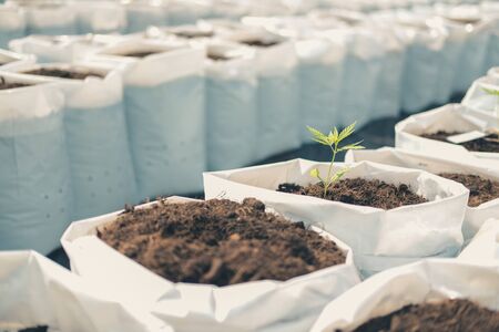 Young seedlings of cannabis in a greenhouse. Cultivation of cannabis