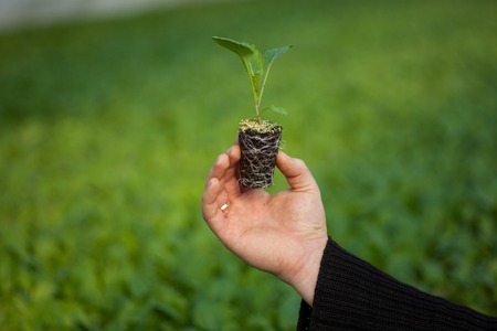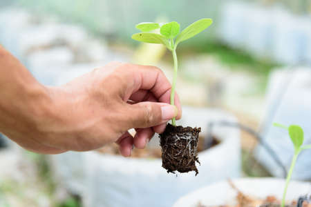 growing green seedling or small tree on soil. Working in the organic vegetable garden, taking care of young seedlings and transplanting young plants into the garden soil.Growing green seedlings in a greenhouse. Preparing the garden for spring. Image with selected soft focus