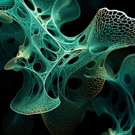 a biological polygon 3d artwork featuring free downloadable wallpapers in various colors. the artwork is inspired by the style of x-ray film and art nouveau, showcasing organic flowing lines. the color palette includes dark turquoise and green, with intricate engraving and macro photography capturing the details. the subject matter includes bones and the unique caffenol developing process. ai generated