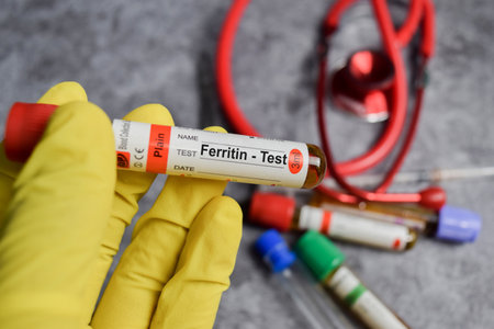 Ferritin - Test vaccination drug syringe in gloved hands. Medical concept