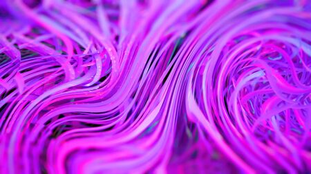 3d render. Curl noise line. Abstract bg with grow blue purple lines like glossy ribbons forming curl noise. Creative colorful 3d motion design background. Subsurface glow material. Curved lines