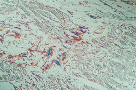 hearth with amyloid deposits of sick tissue under the microscope 200x