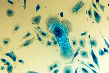HeLa cervical cancer cells, stained with Coomassie blue, under microscope.