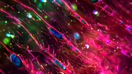 Discover a vibrant abstract microstructure showcasing cells and biological elements, illuminated with stunning colors and intricate patterns that evoke creativity.