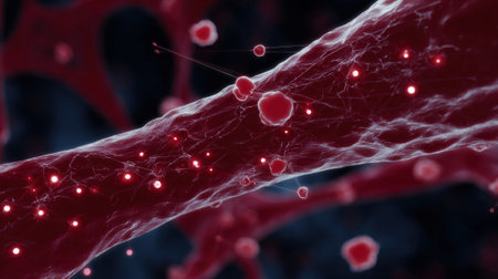 A closeup of a runners vessels under a digital microscope highlighting the swarm of intelligent nanobots at work directed by AGI seamlessly patching capillary microtears as the athlet